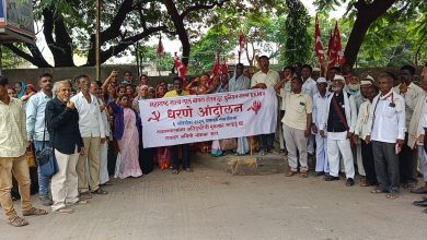 लाल बावटा शेतमजूर युनियनचे धरणे आन्दोलन • गायरान धारकाना अतिवृष्टीग्रस्तांची नुकसान भरपाई दया. • अदानीला लिजवर जमीन.आम्हालाही ५० वर्षाच्या लिजवर…