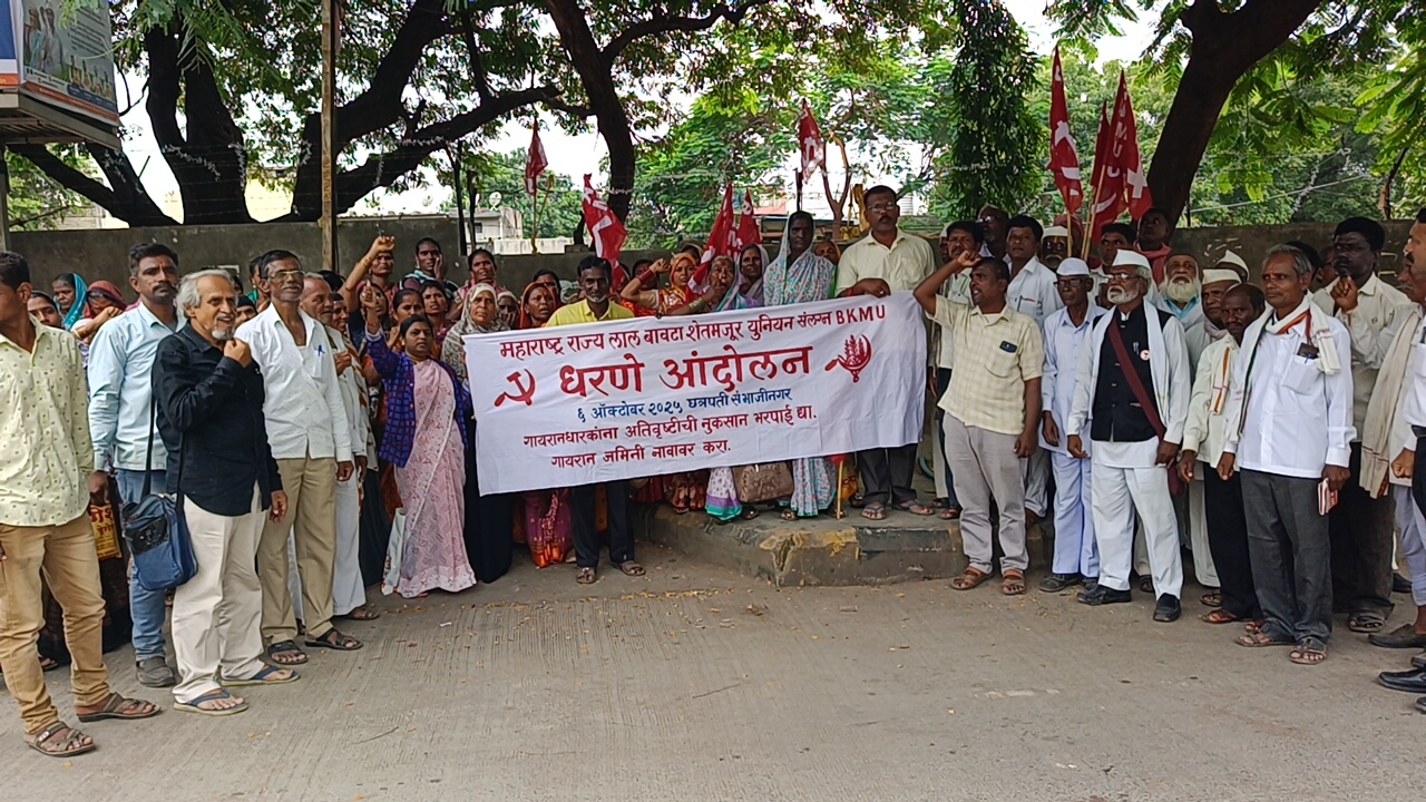 छत्रपती संभाजी नगर दि.६: अतिवृष्टीमुळे ज्यांचे नुकसान झाले आहे त्यांचे पंचनामे करून मदत देणार असल्याचे शासनाने जाहीर केले आहे.या पार्श्वभूमीवर गायरान जमीन व त्यातील पिके,घरे ,जनावरे आदीचे नुकसान झालेल्या गायरान धारकाना देखील कुठल्याही प्रकारचा भेदभाव न करता एकरी ७० हजार रुपये प्रमाणे नुकसान भरपाई देण्यात यावी ही मागणी करण्यात आली. तसेच अदानी व इतर भांडवलदाराना ज्याप्रमाणे उद्योगासाठी प्रतिवर्ष प्रती एकर १ रुपये लीजवर शासकीय जमिनी दिल्या जातात त्याप्रमाणे गायरान जमीन धारकांनाही ५० वर्षाच्या भाडे तत्वावर दरवर्षी एकरी १०० रुपये दराप्रमाणे कसण्यासाठी लीजवर जमिनी दया या प्रमुक्ख मागण्यासाठी आज भारतीय खेत मजदूर युनियन (BKMU) शी सलंग्न असलेल्या राज्य लाल बावटा शेतमजूर युनियनच्या वतीने जिल्ल्हाधिकारी कार्यालयासमोर धरणे आंदोलन करून निवासी जिल्हाधिकारी श्री.विधाते यांना निवेदन देण्यात आले.निवेदनात करण्यात आलेल्या इतर मागण्या – कलेक्टरचे दि.१७ जुलै २०२५ चे परिपत्रक तातडीने रद्द करावे व गायरान धारकामध्ये पसरलेली दहशत दूर करावी ,१९९१ च्या जीआर मधील तारीख बदलून आजपर्यंतची सर्व अतिक्रमणे नियमित